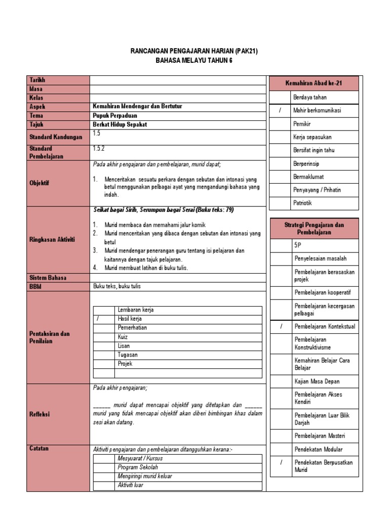 Templat Rancangan Pengajaran Harian RPH Pembelajaran Abad ke-21 PAK-21 Assalamualaikum dan selamat sejahtera. Kemudian beberapa butiran lain seperti. Contoh karangan bahasa melayu sjkt tahun 4 5 6.